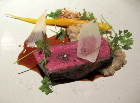 The most incredible dish was the one that seemed the most down-to-earth and home-style: milk-poached and caramelized sunchokes in chicken dashi with baby spinach and coriander flower. The chicken dashi was light, flavorful and comforting and the baby spinach was refreshing, while the coriander flower added a burst of peppery piquancy and the sliced sunchokes imparted earthy crunch. Two delightful meat dishes were next — roasted squab and Border Springs lamb — followed by two original pristine and uncloying desserts — yogurt mousse and carrot and parsnip in buttermilk with vadouvan.