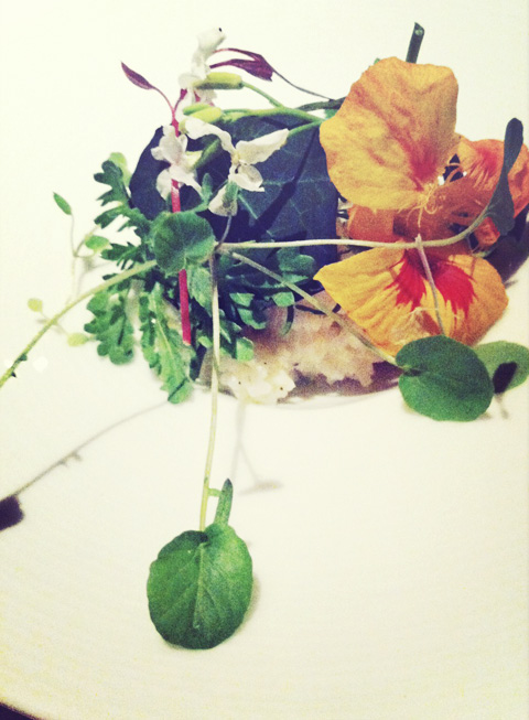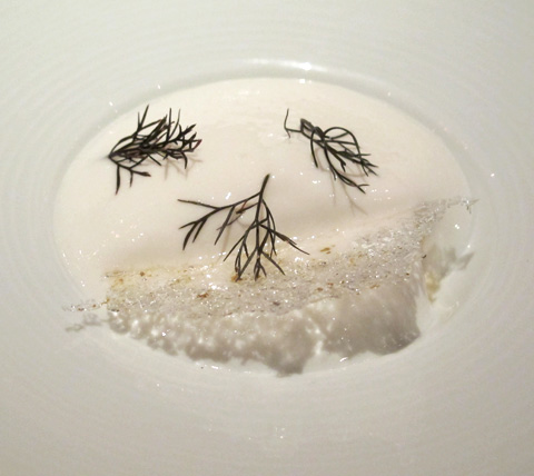 The next act was a flounder encrusted in lichen, served with wild crosnes and sliced green almonds in a butter vinaigrette — a most delightful and inventive palate-tickling fish dish. Upon finishing each dish, I thought, “They can’t top this one,” but the surprises kept coming.