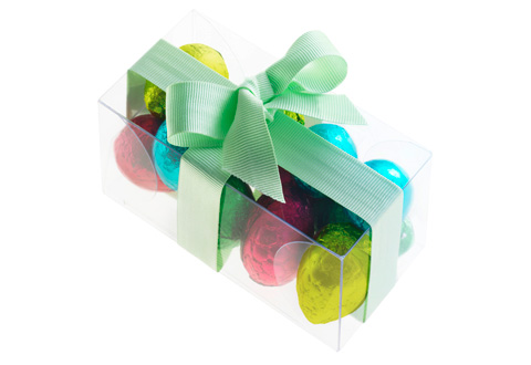 Valrhona’s dozen colorful, foil-wrapped chocolate eggs come in a clear oblong box tied with a powder green ribbon.