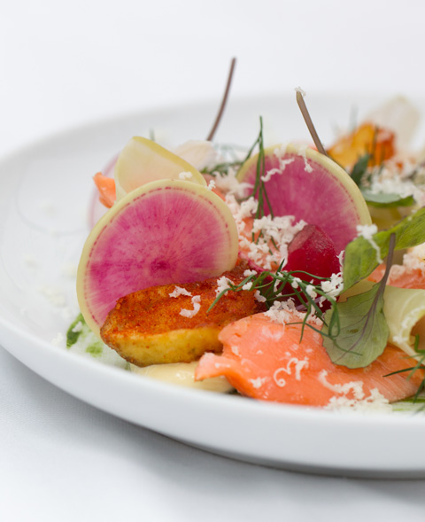I love the multitude of flavors, textures and colors in this beautiful dish from chef Lee Cooper. The bounty of four local British Columbian farms is laid out on the plate with precision and care. Bright orange, just warmed-through steelhead trout fillet and crunchy deep-fried pieces of potato nestle on a Dijon mustard and mayonnaise base. Dotted among them like jewels in a royal crown are white-rimmed pink radishes, pickled garlic and baby cabbage and dill leaves dressed simply in olive oil and lemon juice. A soft-boiled egg half and a dusting of grated fresh horseradish add smooth, rich and bitter notes. Cooper says he especially likes the sharp flavors of the horseradish, dill and mustard, and that steelhead works best because it’s strong enough to stand up to those forceful flavors.