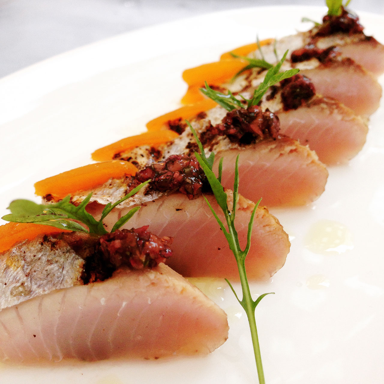 On a recent summer evening, my friend and Cravings contributor Nancy Matsumoto suggested we grab a drink with delicious seafood at The Sea Grill, and I am so glad she did, because we were completely blown away by the array of goodies chef Yuhi Fujinaga prepared for us. The meal began with wild sweet shrimp from the coast of Ni’ihau in Hawaii — Yuhi and I are both from Hawaii, so when he brought this out, I almost cried with joy. It was followed by an oyster platter of both my favorite shigoku and Naked Cowboys. Then there was the Spanish mackerel with bottarga and ume-shiso (plum and perilla) sauce that would make any seafood lover swoon. New on the Sea Grill menu are also seafood tacos, including a crunchy, spicy tuna version and crispy baby octopus soft taco served in a bao bun. I’ve just found my summer happy spot.
